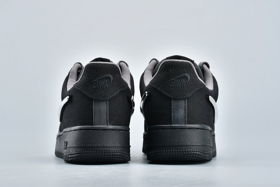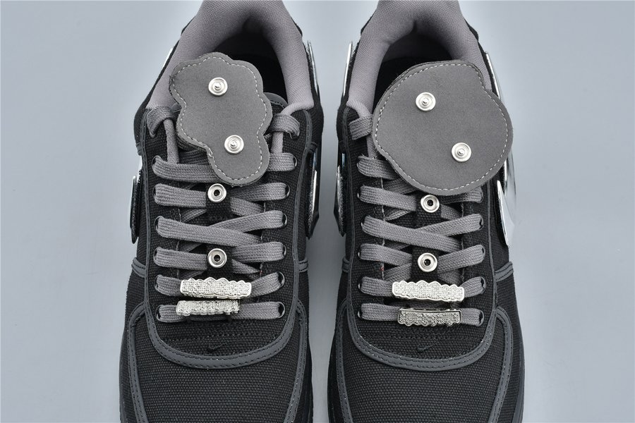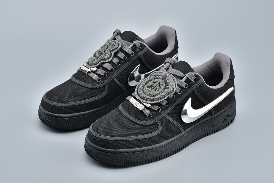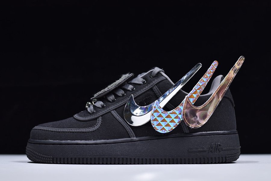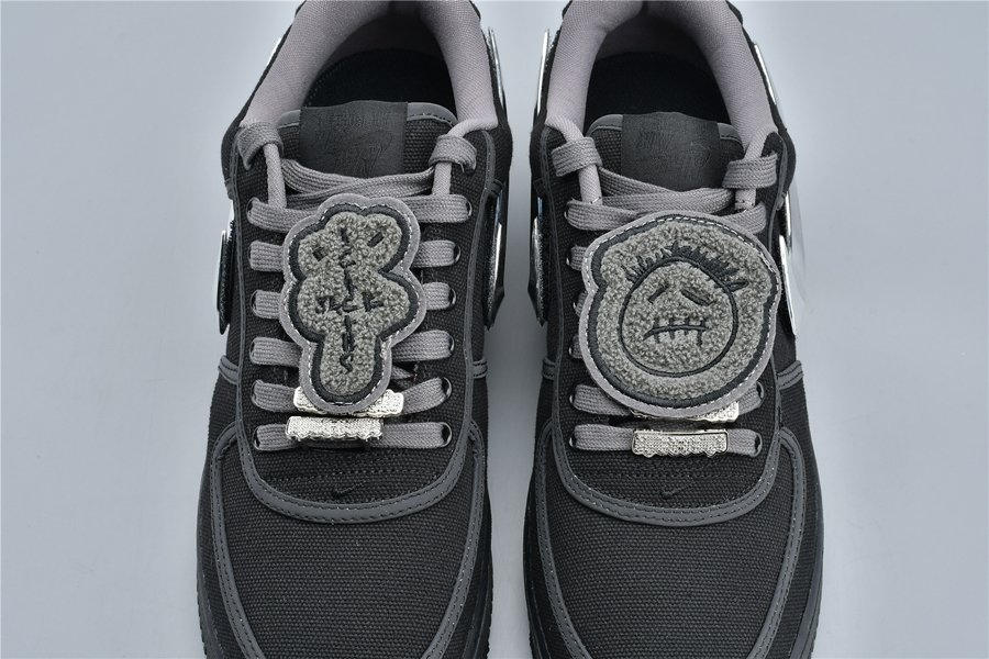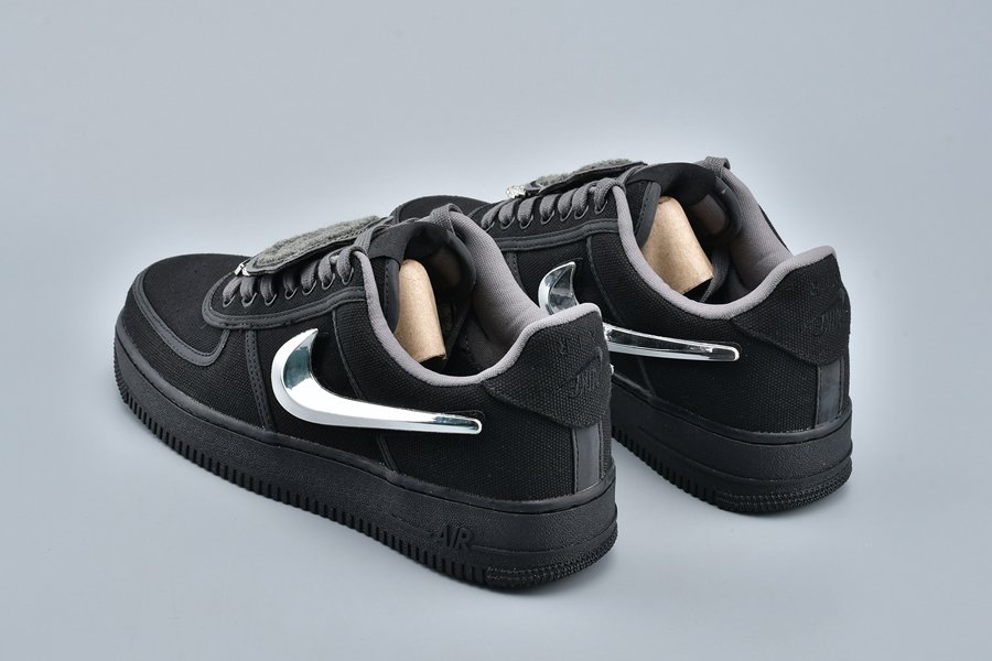 Unlike the original colourways – available in white and sail – the Travis x Air Force 1 Black looks to feature a leather upper. That sherpa lined overlay still features to the tongue but on this pair, in a light shade of grey. That same colour brings contrast to the inner lining and laces.