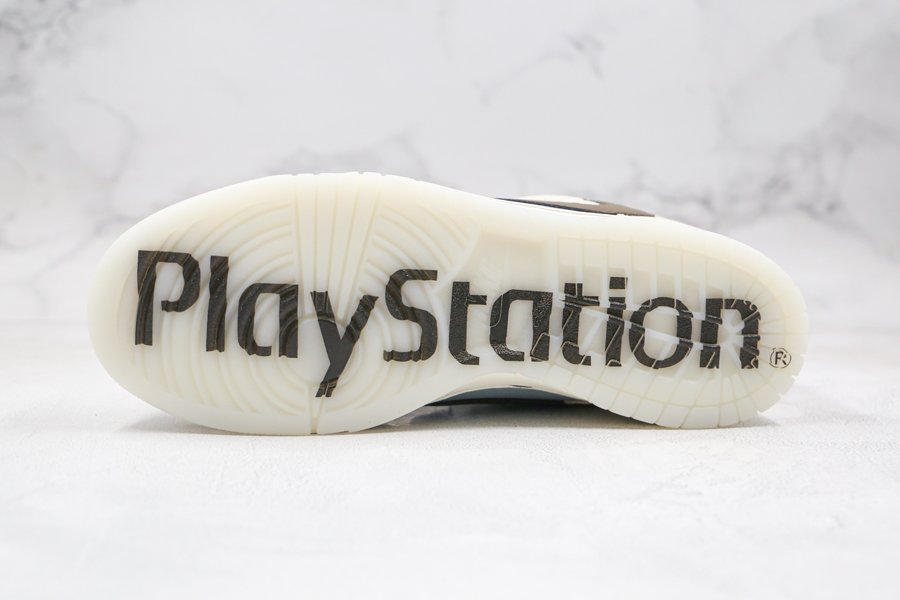 The “TS5” dunks feature a two-tone upper in a muted blue and grey-brown color scheme. The sneaker features a reverse Swoosh on the side – a Cactus Jack signature – with Japanese-style PlayStation branding on the lateral heel and “SONY” embossed on the heel tag. This all sits atop an aged yellow outer sole. “PlayStation” is printed across the soles of the shoes in Japanese on one foot and English on the other.