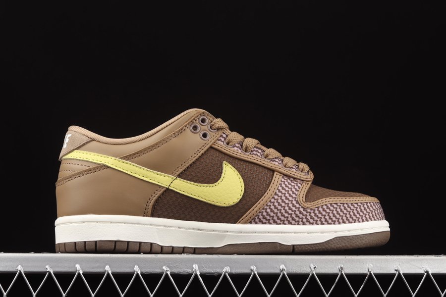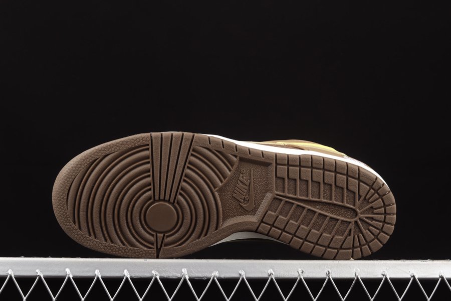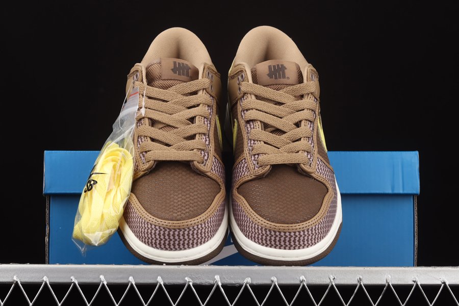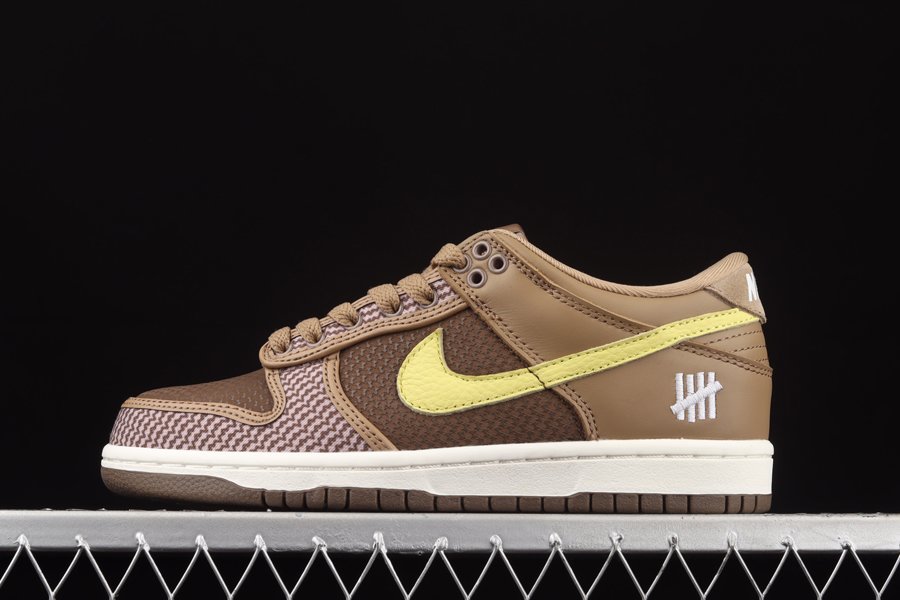 The shoe is slated to arrive in a Canteen/Lemon Frost colorway. This color scheme is the same as one of four UNDEFEATED x Nike Air Force 1 InsideOut Priority colorways that released in 2006, which has us believe that this Dunk is a direct tribute to that AF1. The AF1 featured a brown upper with Lemon Frost Swooshes and “ONYOURFEETKID” branding on the midsole.