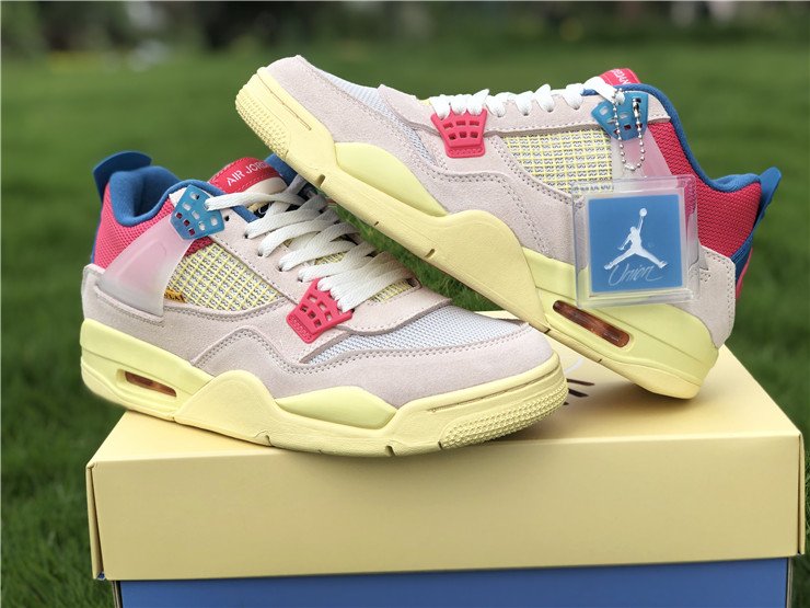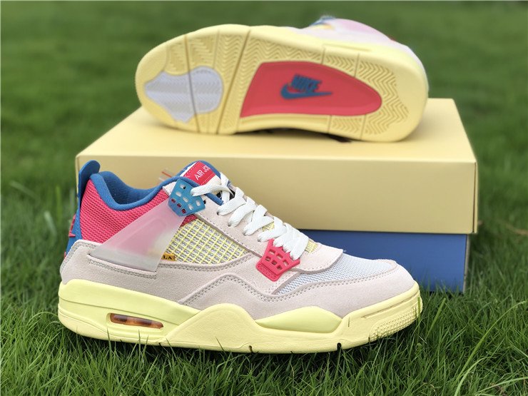 The Union x Air Jordan 4 “Guava Ice” is one of Summer 2020’s most coveted collaborations from Jordan Brand. Union, a Los Angeles streetwear, fashion, and lifestyle boutique, renewed its partnership with Jordan Brand following its monumental Air Jordan 1 collaboration from 2018 on two Jordan 4 colorways with a unique new construction. Beginning with the color scheme of “Guava Ice,” the upper features vintage-inspired yellow netting on the mid-panel and tongue. A sand colored brushed suede base appears on the mudguard, toe cap, and eyelets. White and red engineered mesh detailing dots the toe and collar, respectively. Pink plastic lace accenting clips and a translucent lace support clip add to the eccentric vibe of this shoe. A blue plastic heel clip with contrasting red “Nike Air” adds a classic touch to the decidedly contemporary look. The previously mentioned shortened tongue is actually folded over and stitched down per Union owner Chris Gibbs’ specifications. The wearer is able to remove the stitching to obtain a traditional Air Jordan 4 look.