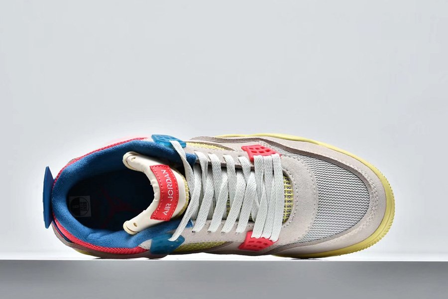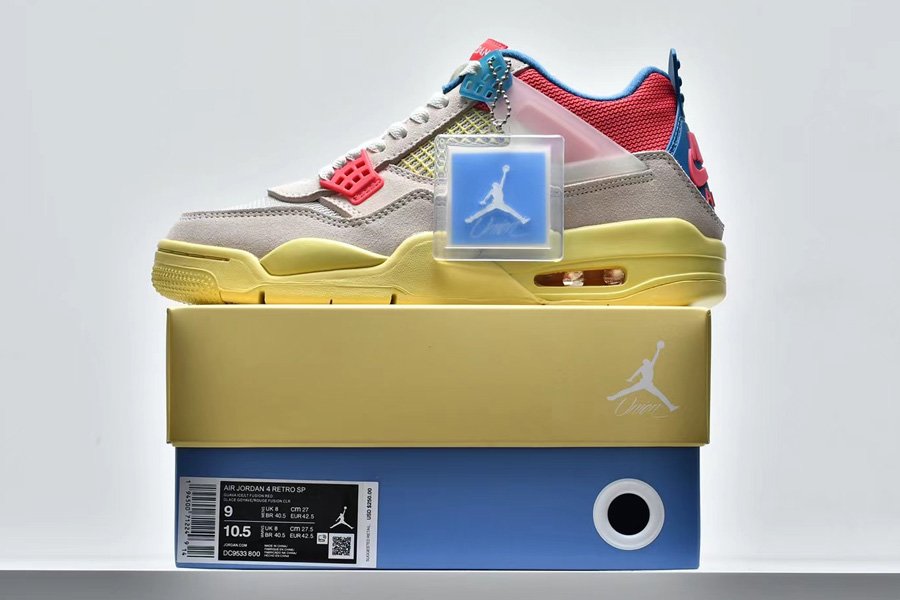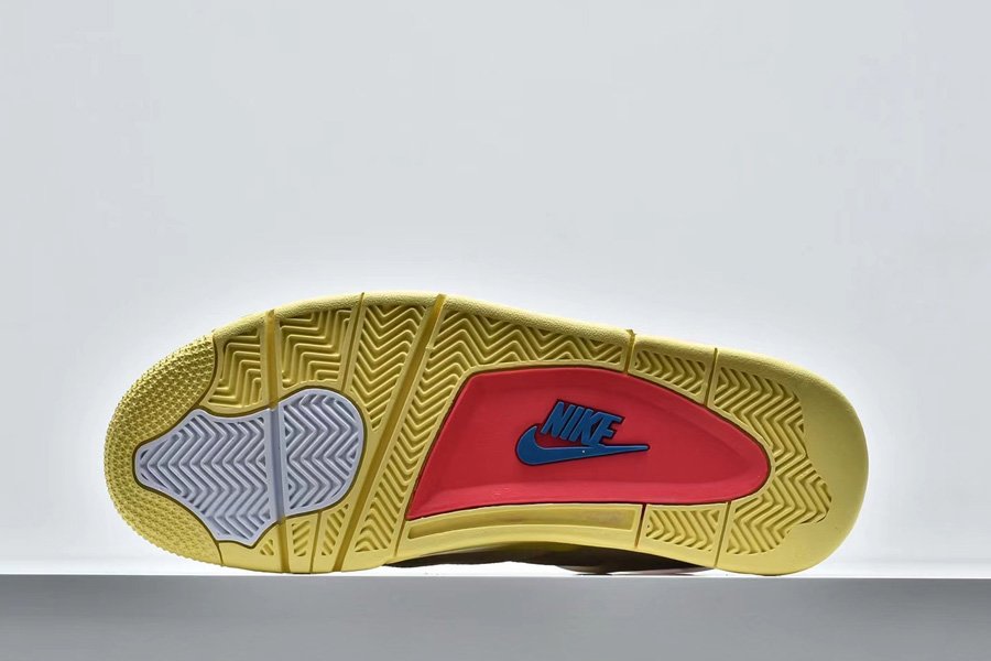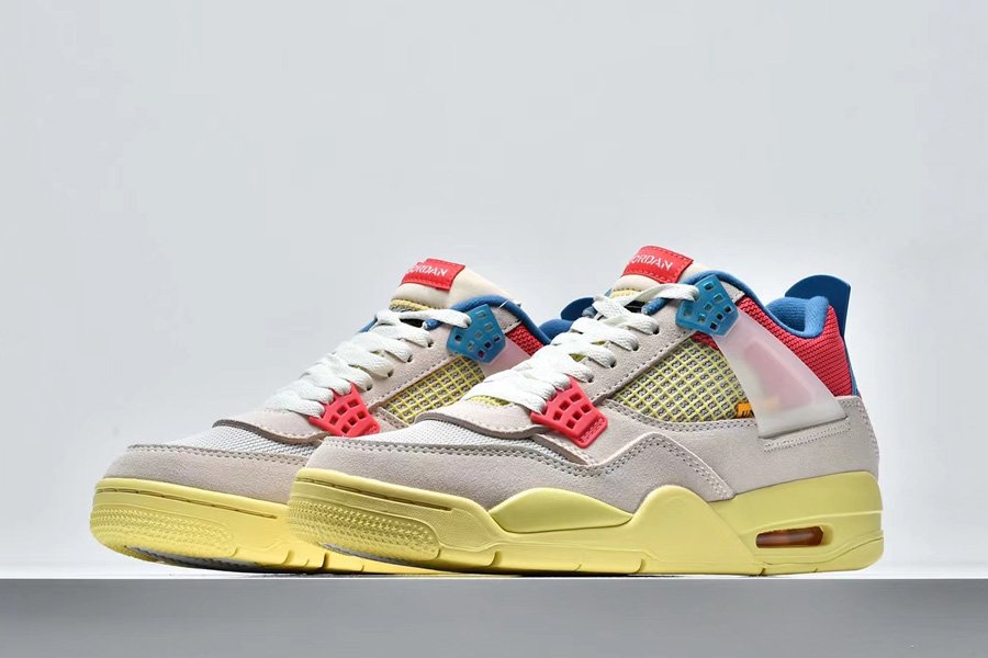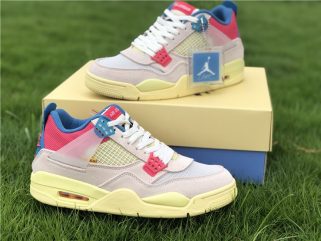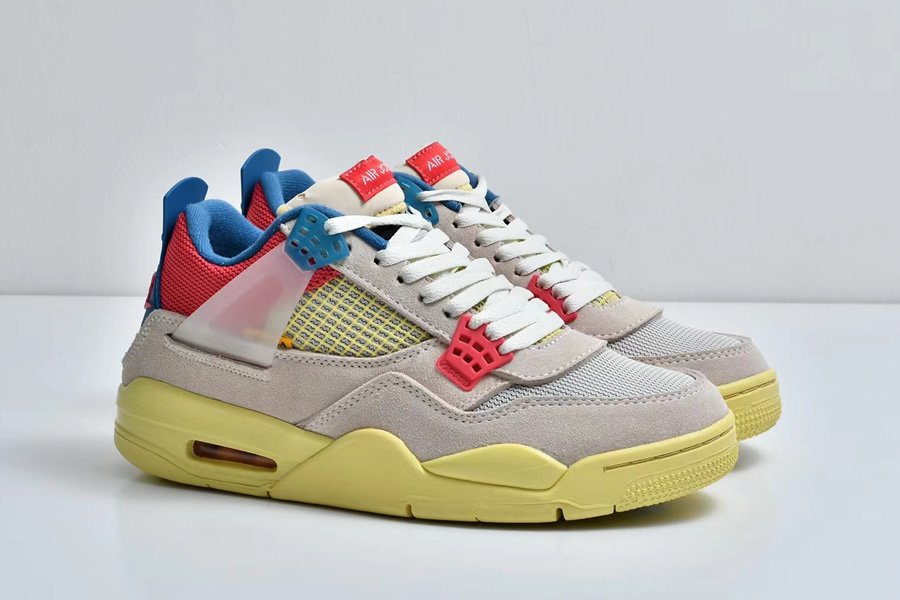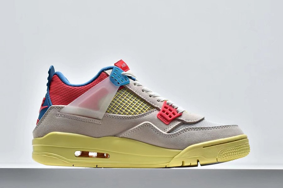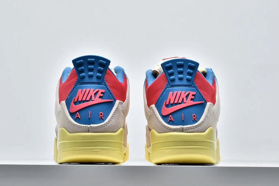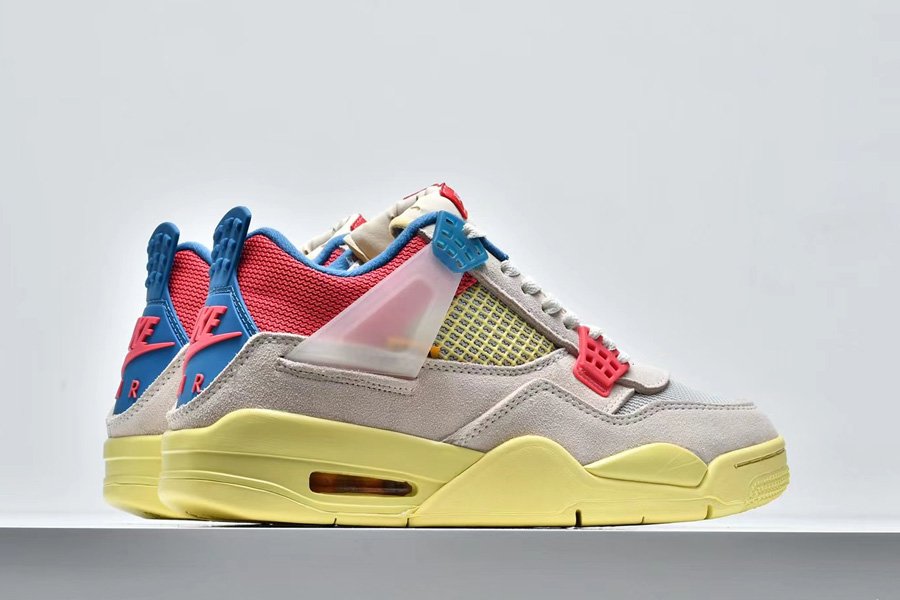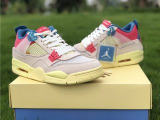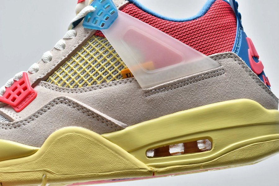 The Union x Air Jordan 4 “Guava Ice” is one of Summer 2020’s most coveted collaborations from Jordan Brand. Union, a Los Angeles streetwear, fashion, and lifestyle boutique, renewed its partnership with Jordan Brand following its monumental Air Jordan 1 collaboration from 2018 on two Jordan 4 colorways with a unique new construction. Beginning with the color scheme of “Guava Ice,” the upper features vintage-inspired yellow netting on the mid-panel and tongue. A sand colored brushed suede base appears on the mudguard, toe cap, and eyelets. White and red engineered mesh detailing dots the toe and collar, respectively. Pink plastic lace accenting clips and a translucent lace support clip add to the eccentric vibe of this shoe. A blue plastic heel clip with contrasting red “Nike Air” adds a classic touch to the decidedly contemporary look. The previously mentioned shortened tongue is actually folded over and stitched down per Union owner Chris Gibbs’ specifications. The wearer is able to remove the stitching to obtain a traditional Air Jordan 4 look.