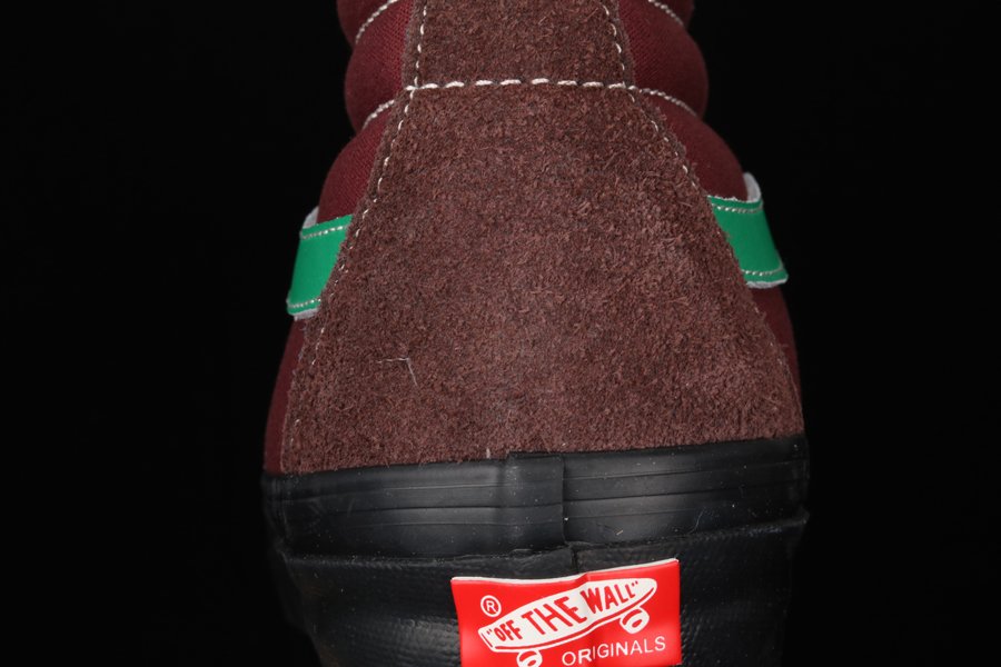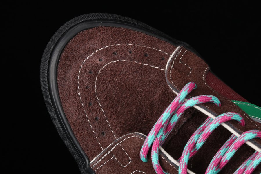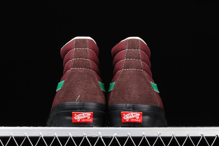 The OG SK8-HI LX comes with “Russet Brown” suede, except this time just along the eyelet panels, tongue, toe box, and backstay. From the collars to the lower body, the sidewalls see a rich burgundy-tinged canvas fabric that comes with green side stripes. Apart from white top-stitching and colorful laces, the Vans Sk8-Hi is decorated with angular perforations that curve around the toe. All of these details sit atop a black midsole foundation, rounding up the darkened color scheme.