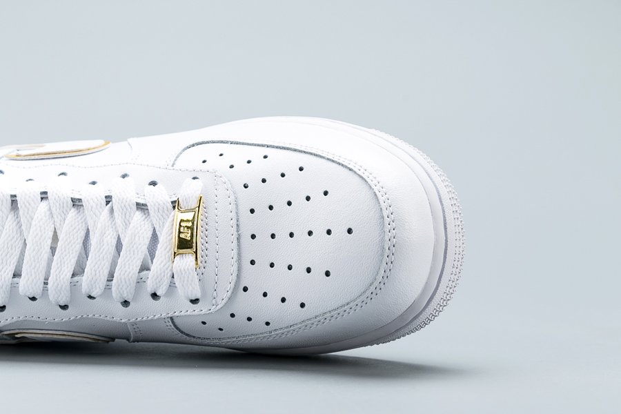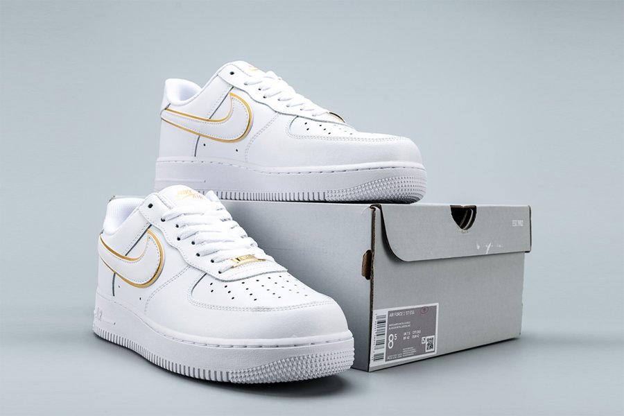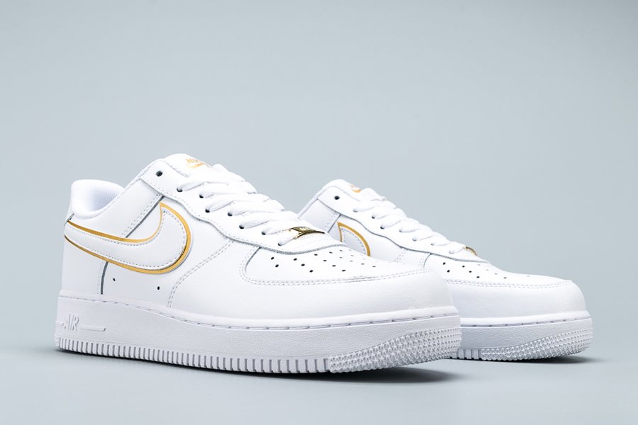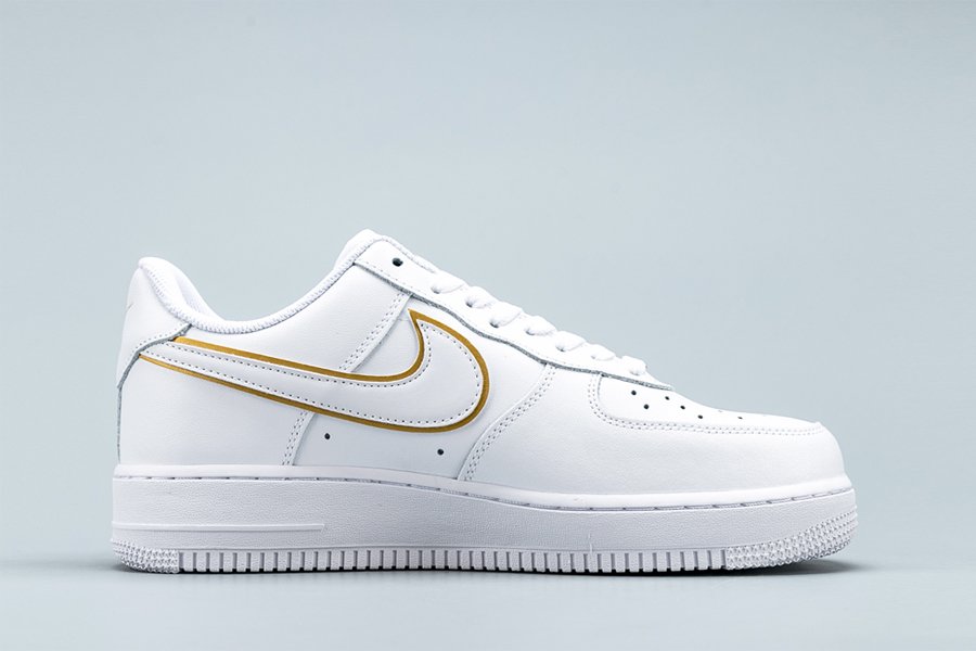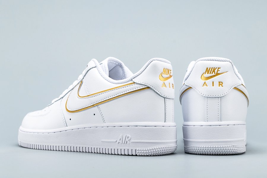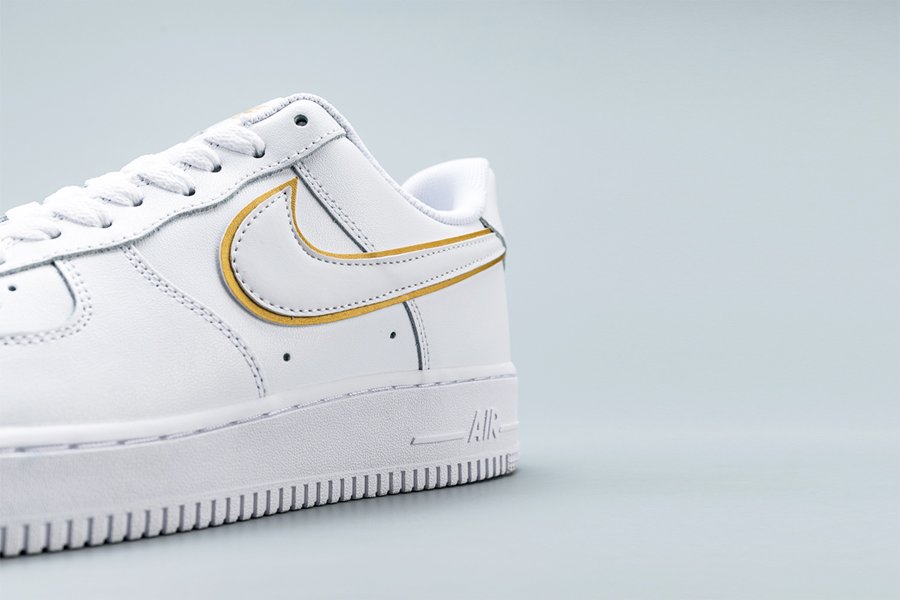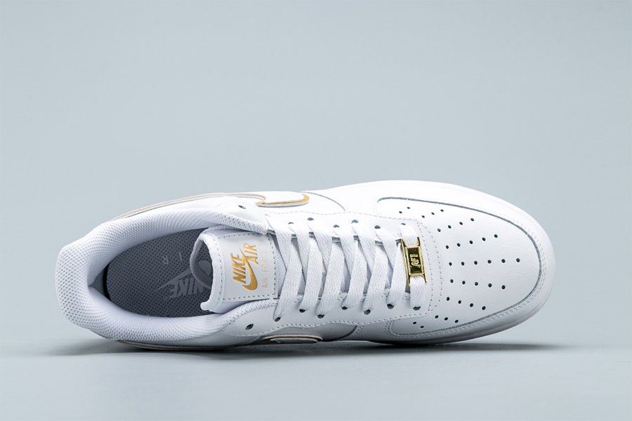 The Nike Air Force 1 07 ESS ‘Metallic Gold’ takes the 1982 hoops silhouette and gives it a gilded update. Released September 2019, this AF1 is rendered in premium leather and features a double Swoosh accented in gold. One of four shoes released in the series, additional gold accents can be seen on the tongue, dubrae, and heel. Nike Air cushioning and durable, pivot-point traction ride below.