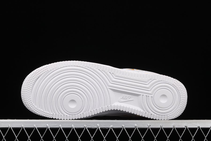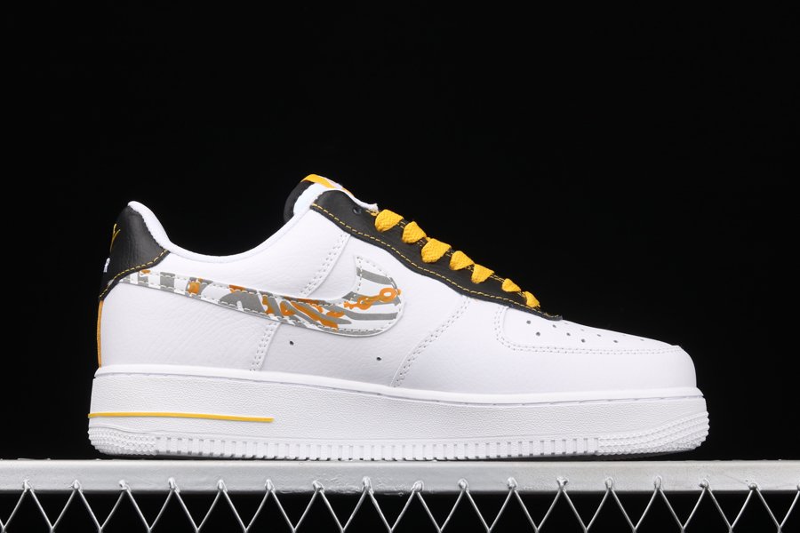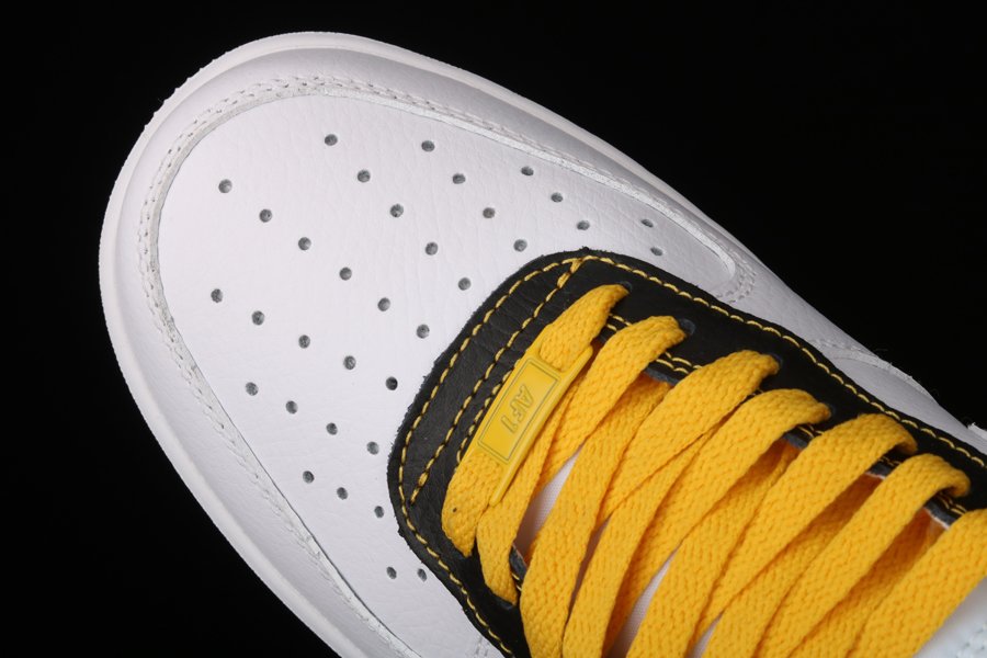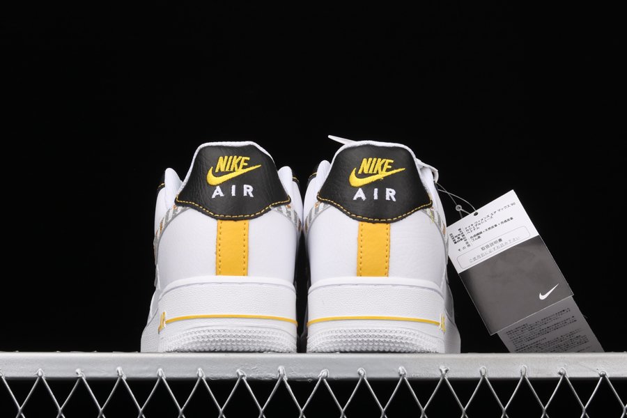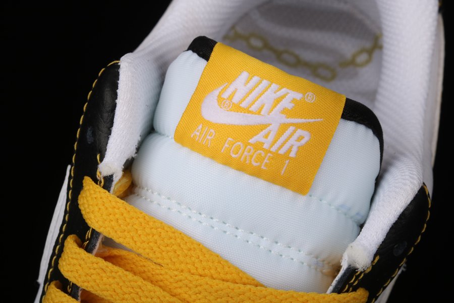 More detailing can be found on the rear of this AF1 in the form of jet-black heel panel housing a gold Nike Swoosh and white Air lettering.