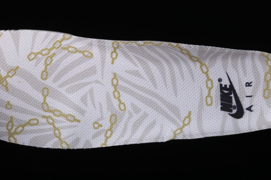 The Swoosh decorating the medial and lateral sidewalls is dressed with subtle light-grey zebra stripes, with a gold chain print interweaving throughout.