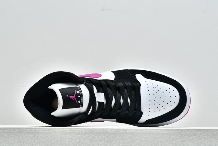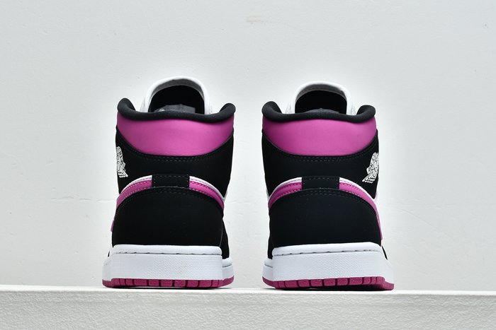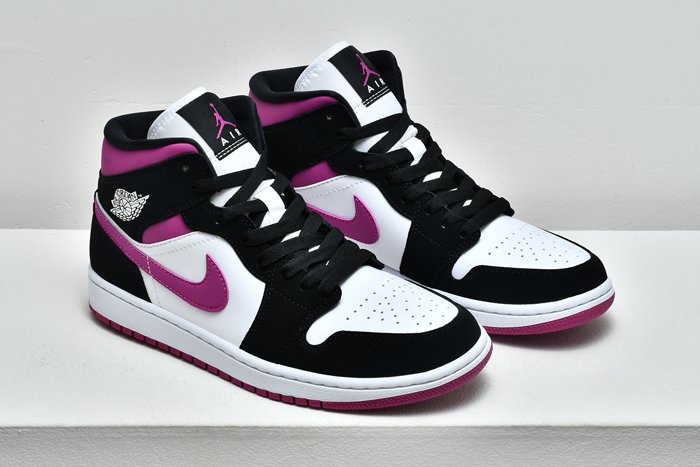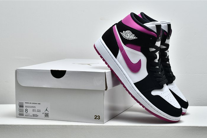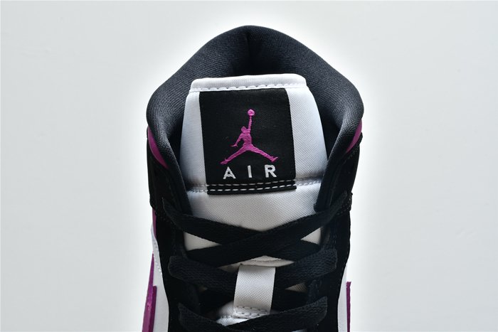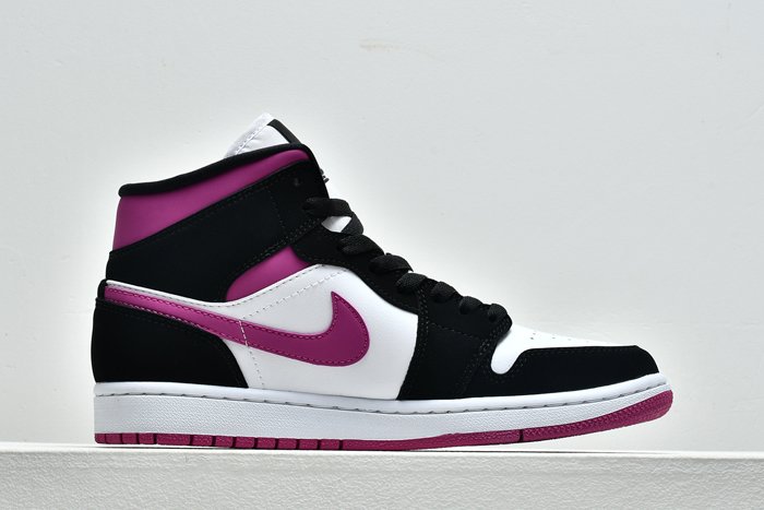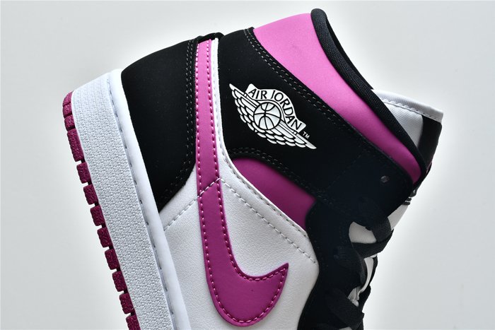 The Air Jordan 1 Mid Magenta features a white leather upper in the toebox and quarter panel, sublimated by a Swoosh and an ankle collar in magenta colour. Black suede inserts contrast with the overall look. The usual branding elements, such as the Wings logo on the ankle and a Jumpman on the tongue, refine the look.