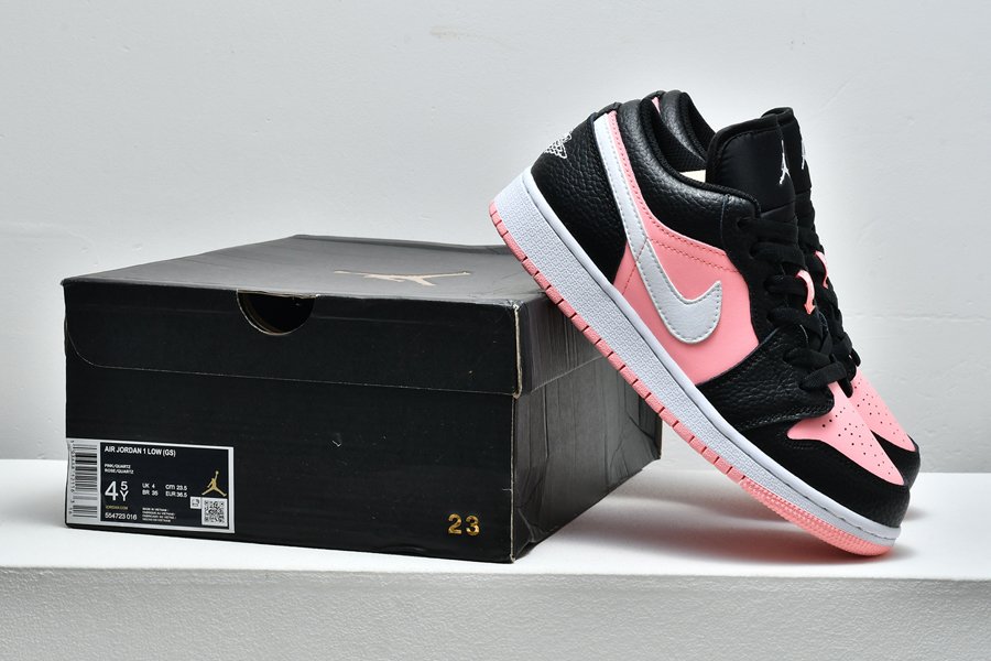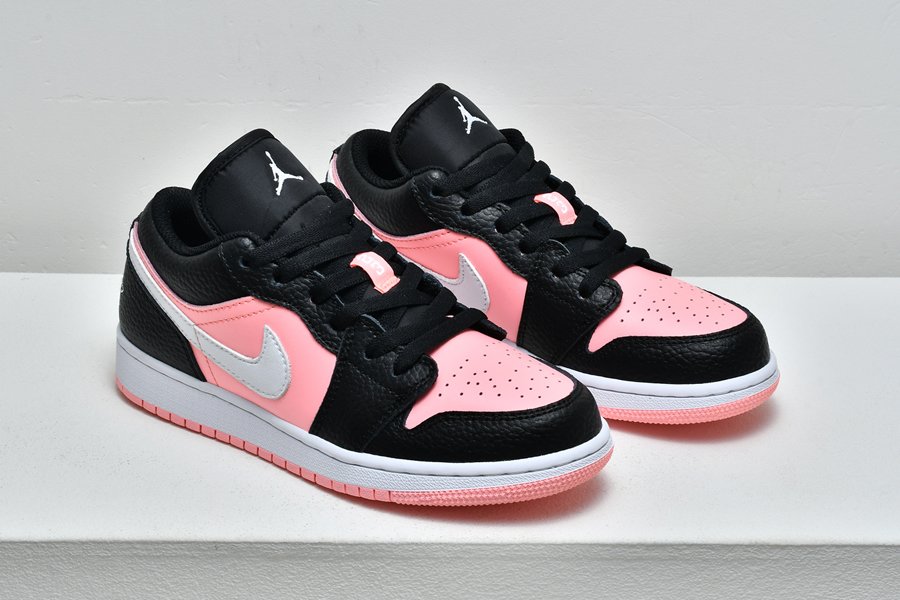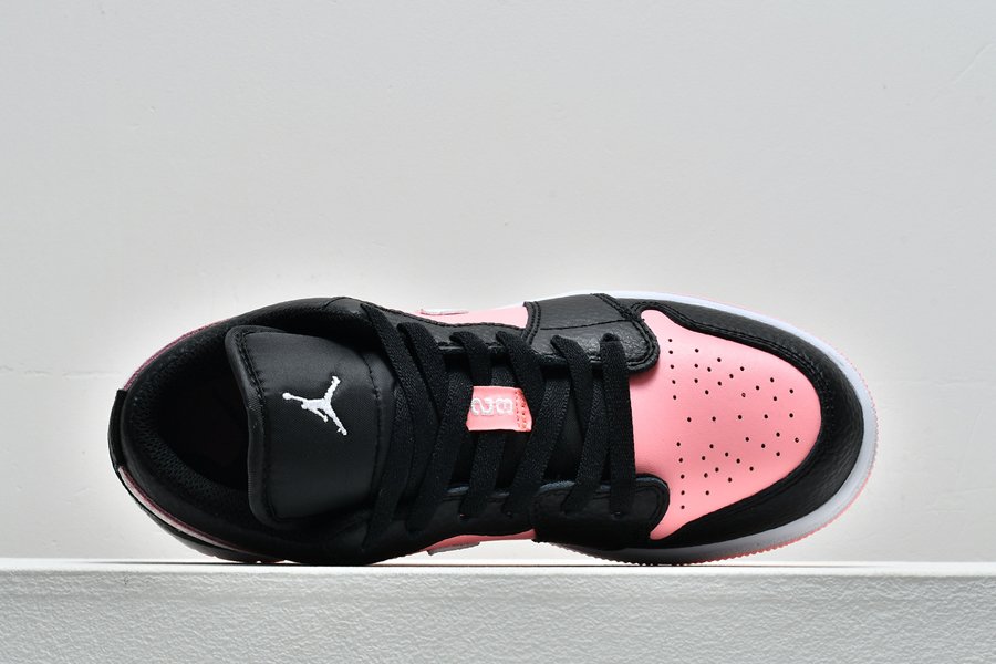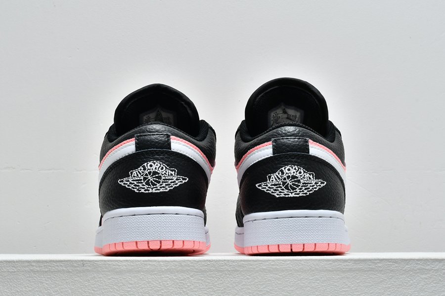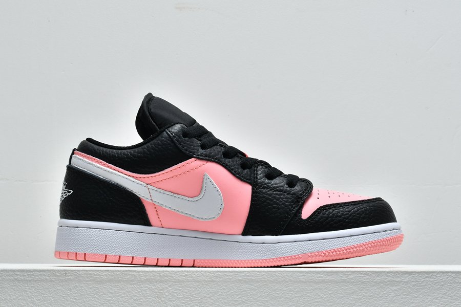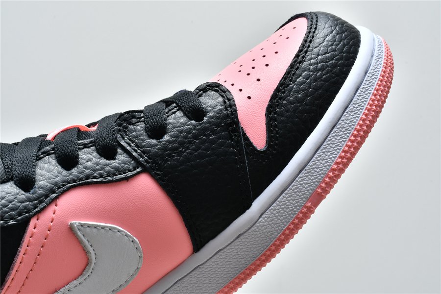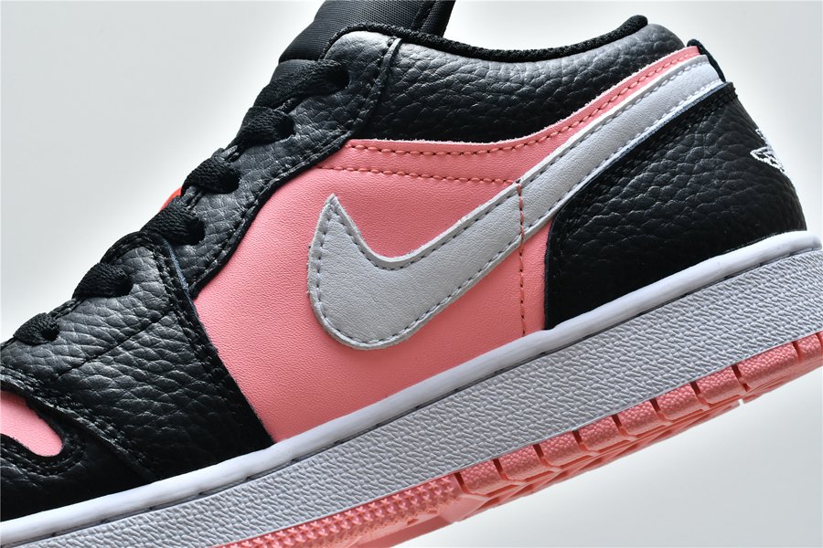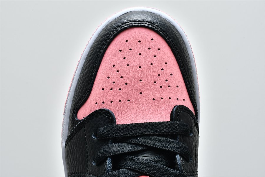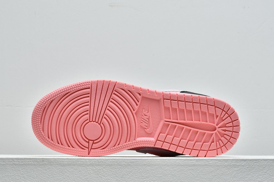 Smooth pink leather dominates the upper, with black tumbled leather overlays adding that extra spice. The white midsole matches the white Swoosh and Wings logo splattered on the heel counter. Tying the whole shoe together is the pink outsole mixed with the 23 on the pink lace keeper.