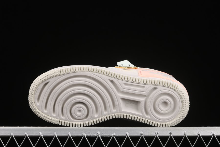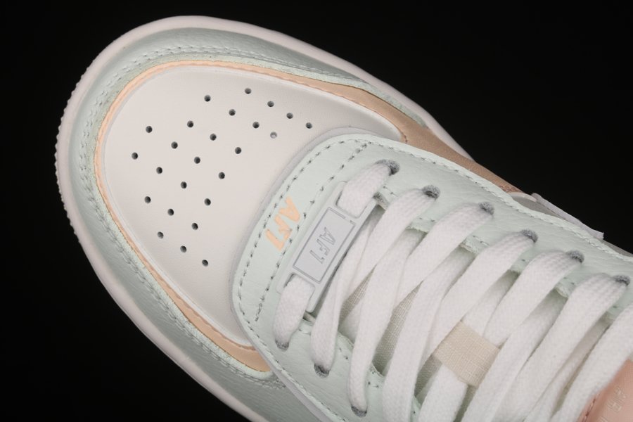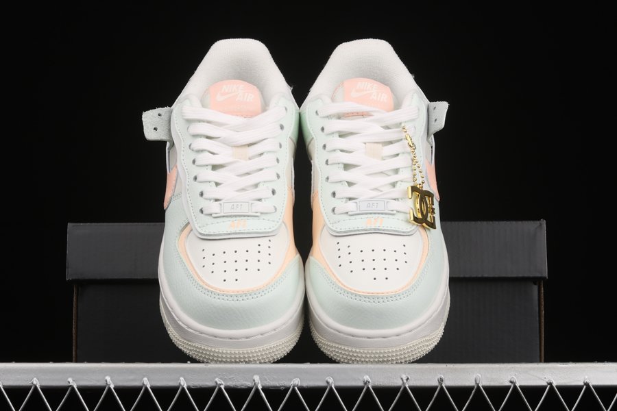 The Nike Air Force 1 Shadow Barely Green features a leather base and a multitude of split elements at the Swoosh, AIR tags and eyelets. Each branding element is presented in an orangey pink colorway that stands out against the light green details. A cream outsole enhances the look.