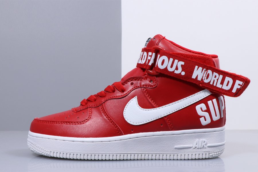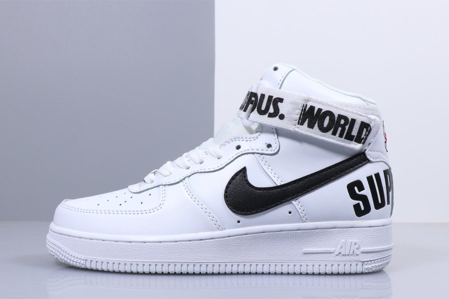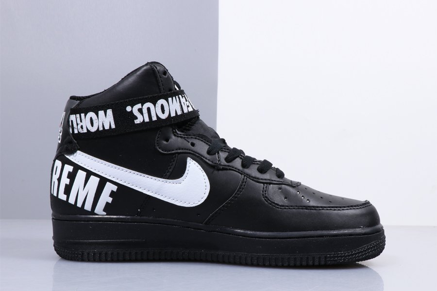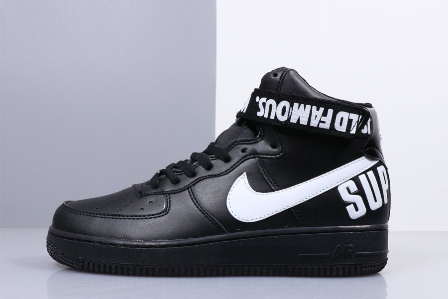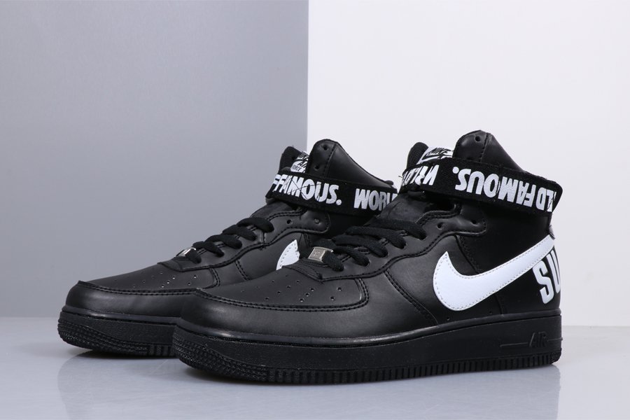 This go around, the duo brings out the best in the Nike Air Force 1 High and decks it out in a Black and White palette. The co-branded shoe features the iconic Supreme logo on the heel, and also works in the “WORLD FAMOUS” tag along the ankle strap.